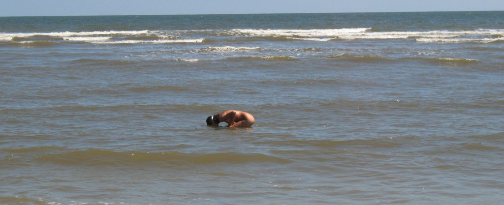 I don’t remain there long, as I am invited out into the surf again. We wander out to where it is finally maybe waist deep. Suddenly something about three or four feet long zips between us. We stand stunned. It was brown. It reminded me of the dog sharks that we occasionally caught fishing in the sea up near the Chesapeake Bay, when I was a kid. It felt unnerving. I’m feeling entirely naked out here.