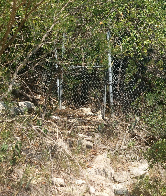 We look out across a Lake Travis vista as we head down a steep incline to the gate.