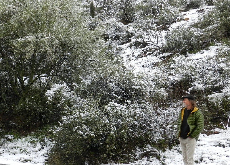 After the appointment, we headed up into the Tucson Mountains to visit the desert in its unusual look. We didn’t get naked in any way; there were plenty of people up there doing the same. We did take photos of the unusual dichotomy of desert and snow. We threw it at each other and ate the fresh fallen white.