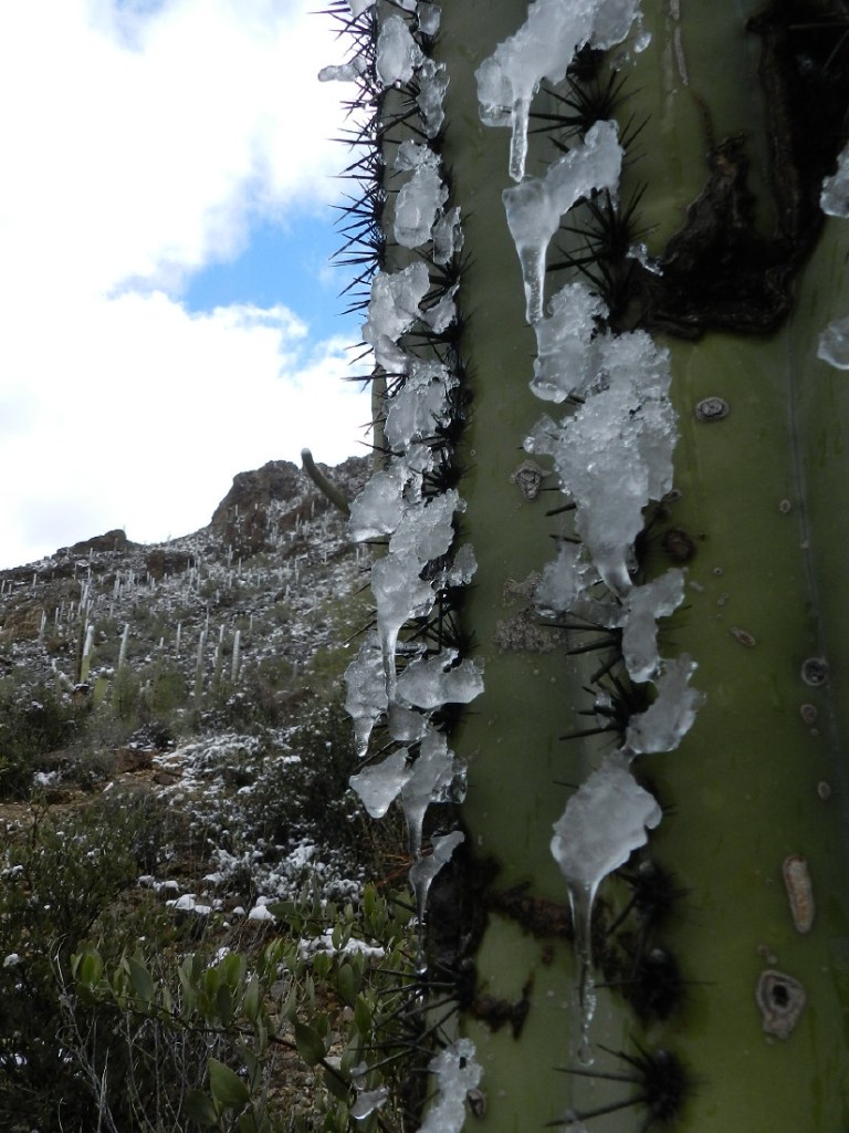 It doesn’t last very long. We watched the sheets fall off of the saguaros, the icicles dripping slowly from needles.