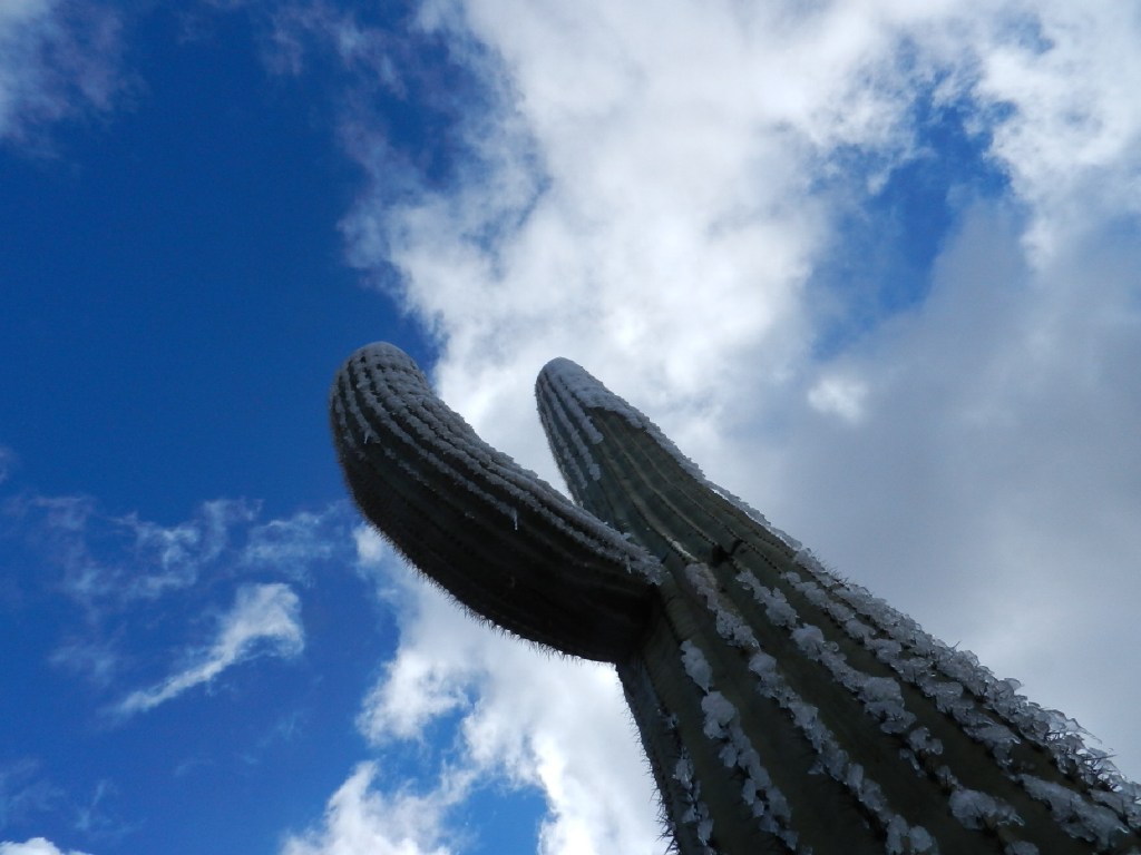 We were visiting during the end of the short snowy period, before noon. Still the saguaros on the northern slopes were coated, arms out, like kids playing in the snow. Some, looked ghostly covered completely in a white sheet.