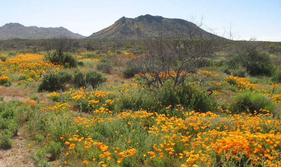 Suddenly, a field of yellow Arizona poppies shows, glowing in their florescence.