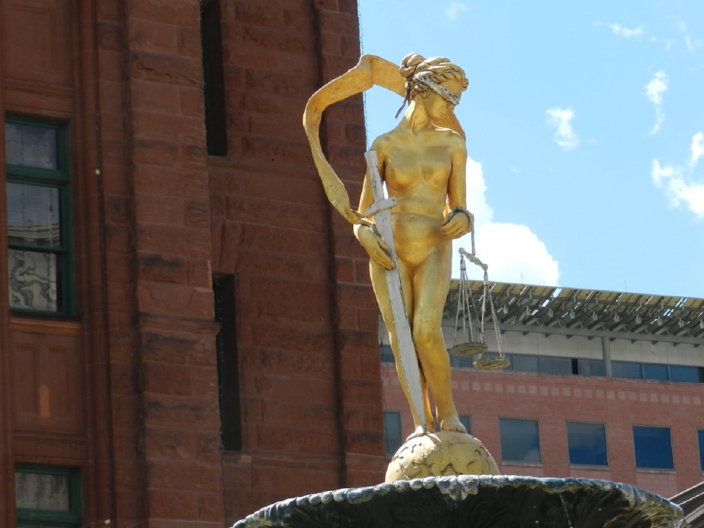 The court house is nearby. There, we find a statue of blind justice, a golden lady, with balancing scales and a huge sword. She wears absolutely no garments, as she stands on her pedestal.    So, you know, I have to remark, how while justice is naked, anyone else would be prosecuted for being similarly attired. I wonder how far I’d get naked with a sword in hand.