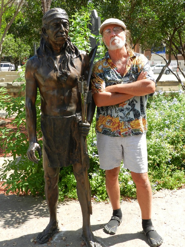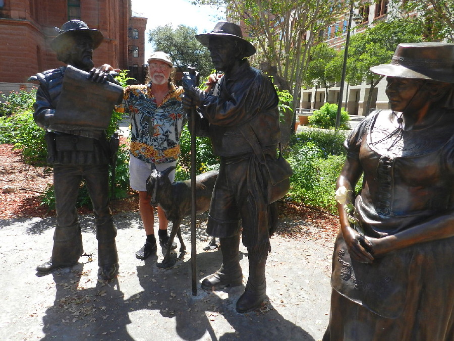 In the same plaza, there is a group of bronze people discussing something. I pal up to a couple of settlers, then I notice a Native American standing near and taking them in.
