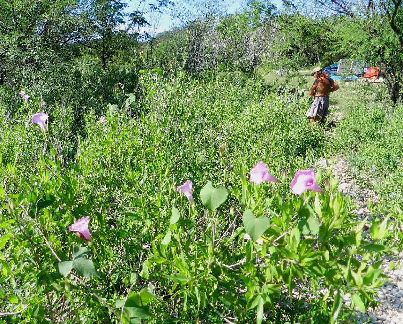 I take a walk before sunset to get a lay of the park. Primarily, I’m looking for a trail down to the river and a swimming hole. There is a thick clump of vegetation all along the road. This is coupled with a steep drop down to the river. It is impassible. I walk the length in search, but no dice.