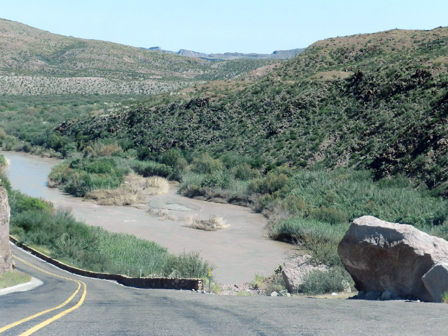 We have arrived at Big Bend. We’re looking out at the Rio Grande River. As the fish swims, somewhere in that river is the United States/Mexico border. The hills just beyond are another country.