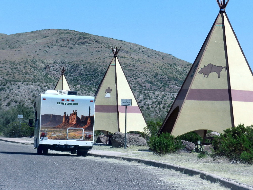 This has a series of Teepees constructed of metal. There has been no real shade for miles and here is an oasis. Each has a picnic table to lunch at and it is lunch time.