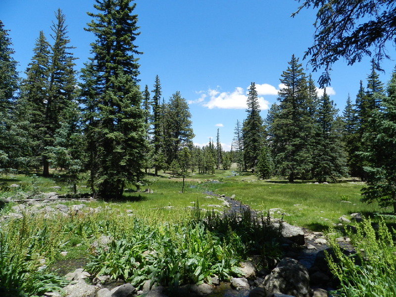We must first drive down to the spring with its creek. It is beautiful. We have camped here before, but the 4th of July crowds will be there and some have arrived early. We need solitude and body freedom.