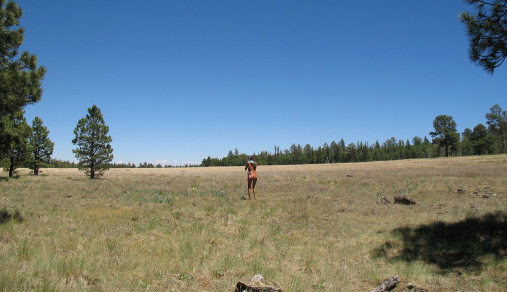 Bright sun, fresh pine scented air, my naked body gets acquainted with the elements of the morning.