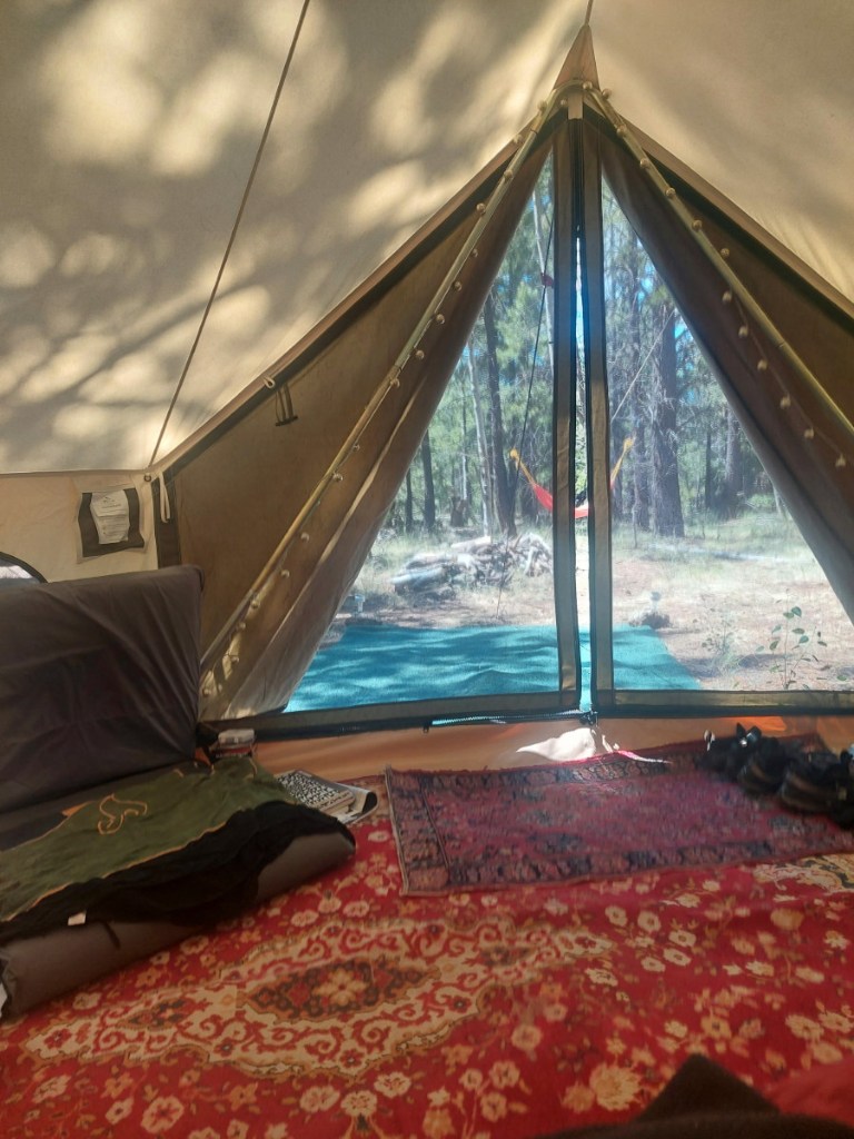 Our bed is slid into position in the tent and I unzip a couple of fresh air windows. I make our bed, lay down with DF and we both approve, relax and test it some more.
