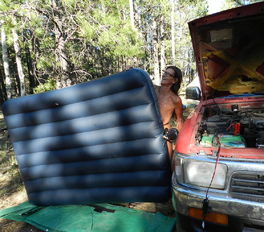 The big air mattress will be next, but DF sheepishly comes to me with some bad news. The bigger bed must be blown up with the car cigarette lighter attachment. The lighter came out with her battery charger. I spend a half an hour attempting to repair it without taking apart the entire dashboard, but to no avail.