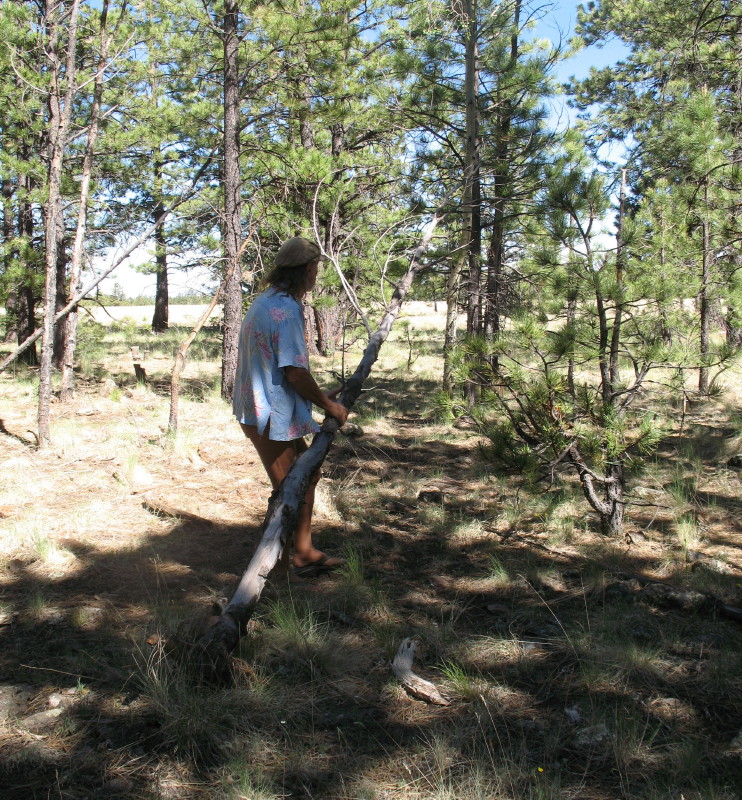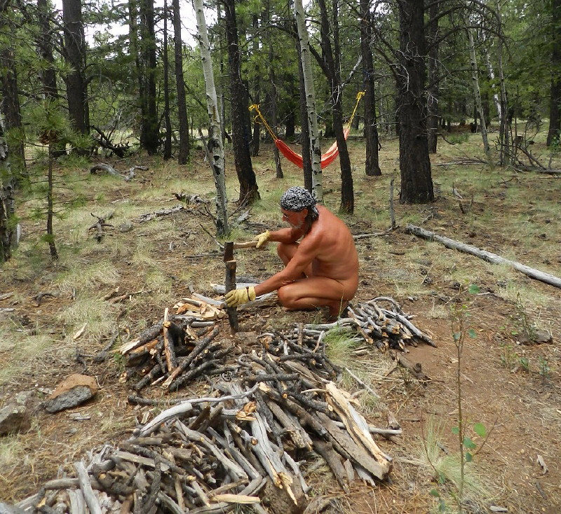 I get more firewood together, small sticks and larger. Over the next few days, I’ll gather a little at a time. I love doing this. I gather the good dry and well sized wood. I get my axe out. Squatting nude and feeling earthy, I chop and split it into the best lengths. I joke daily with DF about it being a manly man’s thing and we sing a mountain man mantra, tongue in cheek.