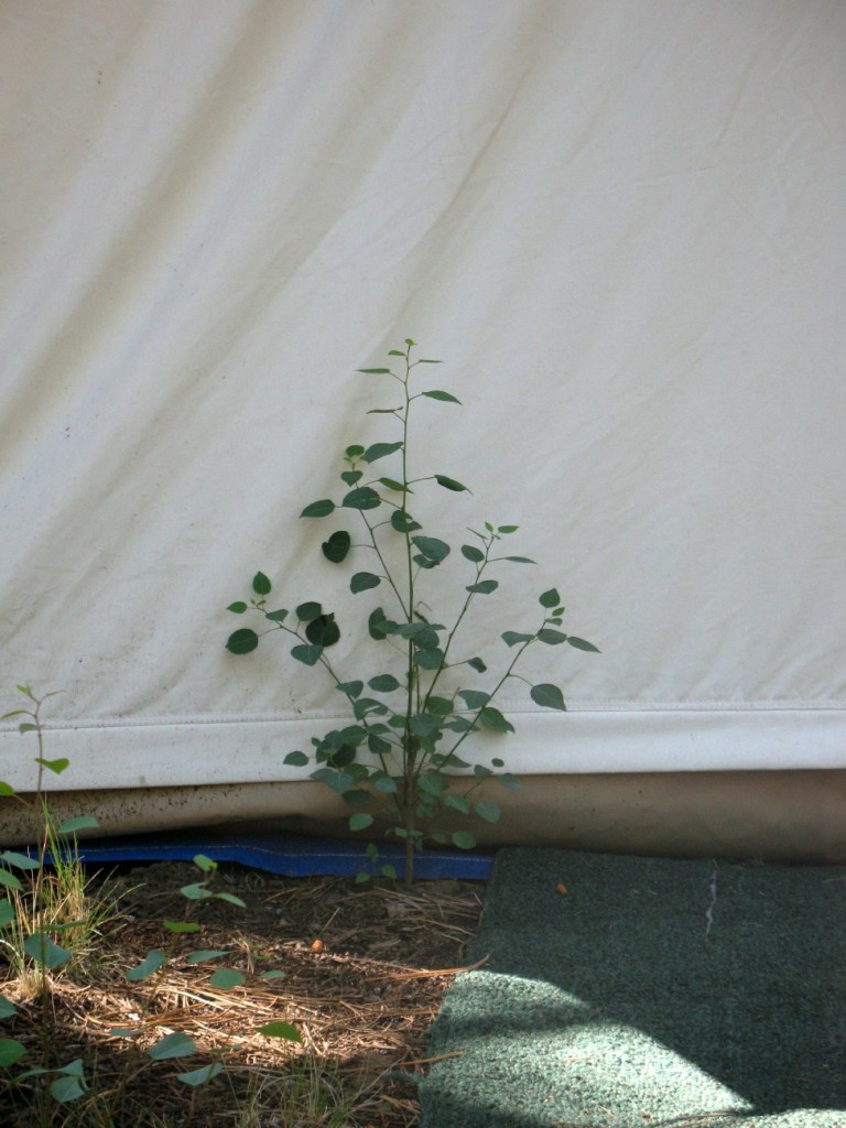 An aspen will sit right next to the tent, brushing the door. I recognize it as one that was mashed under the tent three years ago and it has survived.