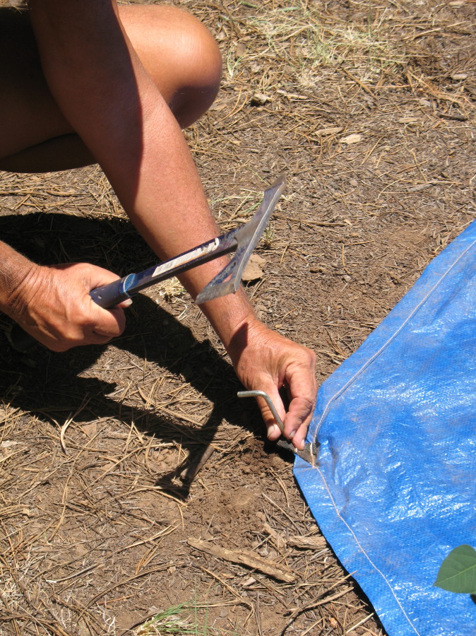 I get the center pole erected and begin to pound in the seeming multitudes of foot-long stakes for guy-lines. I’m dreading the subterranean rocks that will be in the way, but in the end, I’m grateful that there is only one impediment.