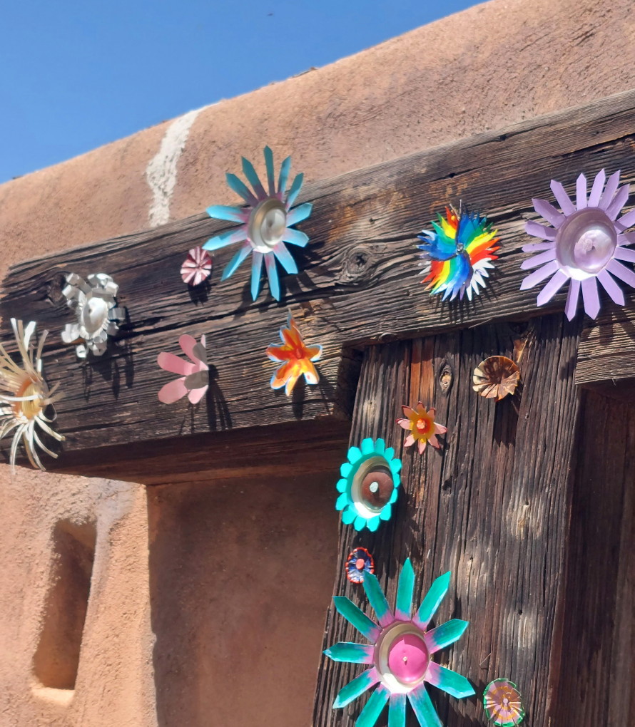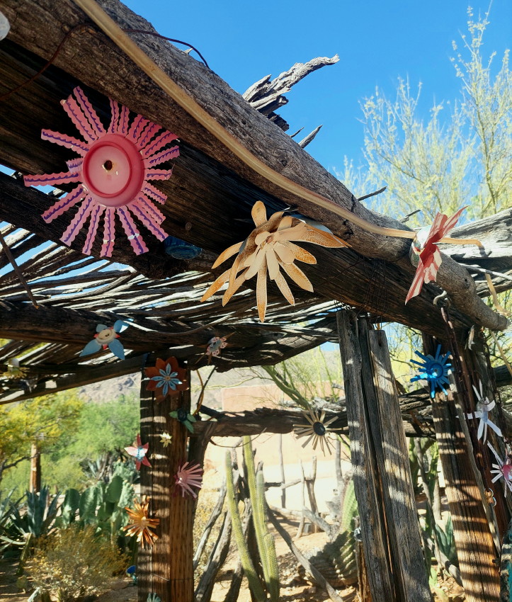 In several spots on the property, aluminum cans have been shredded into flower-like mandalas and painted. These are hung on entry way arches mostly. They also decorate an authentic looking Native American ramada of tangled rustic mesquite wood and saguaro ribs.