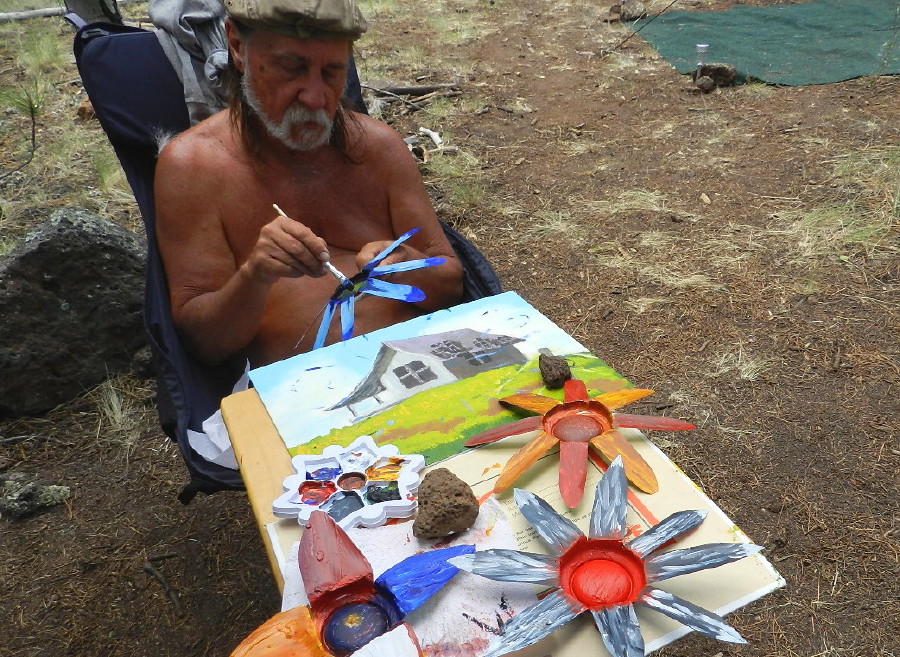 Being constantly naked in a natural forest for days on end, every moment is augmented, more alive, sensual and focused in that moment. The concerns of the other world are cleared away. All of these factors were of benefit, when I sat down to experiment with color, texture and imagination. I was in a good state of mind to paint, or should I be bold to say make art. Coloring the metal flower petals is a Mandala Yoga, in a way.
