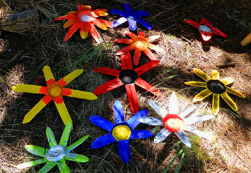 Time came with several weeks in the White Mountains during our sojourn. DF is interested in painting, as she is now into her retirement. We both need practice mixing colors and with what is new to us, acrylic paint. We gathered my neighbor’s aluminum beer cans, a party’s worth of empty soda and tea containers and then I went to work cutting different shaped flowers.