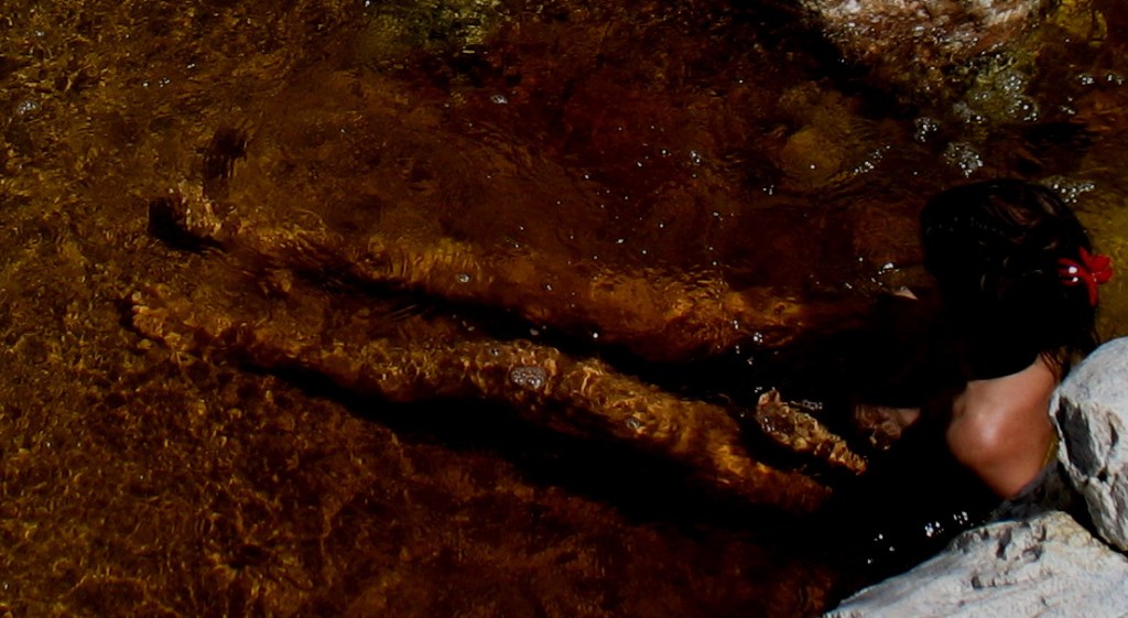 Sun’s going down between the trees. We ate earlier today to align with the sun’s light and warmth. I’m lying in the pink canvas hammock feeling satisfied, looking up at the canopy of evergreen trees. The sun has gotten lower in the sky and light shoots through the deep forest. I’m fascinated by the golden green light. There are streaks of golden green color and the glitter of sap on pine needles. Below, in some places, the glowing grass looks much the same, like a reflection of the canopy. The pine needles high above spike out almost crystalline against a deep grey in the azure sky.