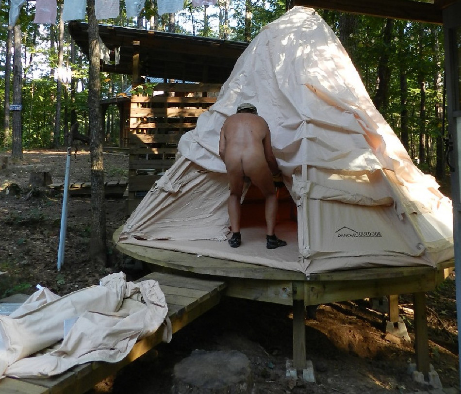 It starts with 16 to 18 people with confused expressions on their faces, being given a nail, a piece of wood, a 3×5 card and a pencil. Around sundown, they all strip into proper sauna attire. DF smudges them, as they entered the sweat, one at a time.
