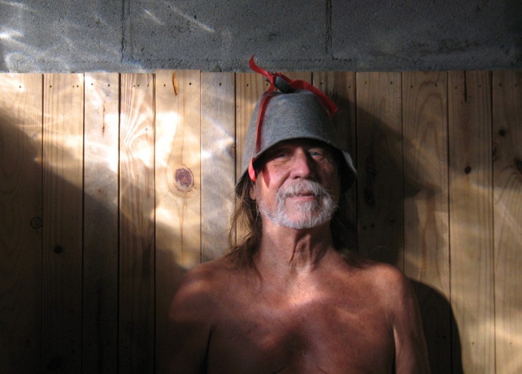 I am waiting inside, next to the ambiance of a candelabrum, my notes are in hand, rolled up like a scroll. I greet each, as they choose their places among the double rows of redwood benches. I had tied red ribbons to decorate the top of my usual Russian felt sauna cap. Before long, job well done, DF enters, finding her own spot on one of the benches, which are now filled cheek to cheek.