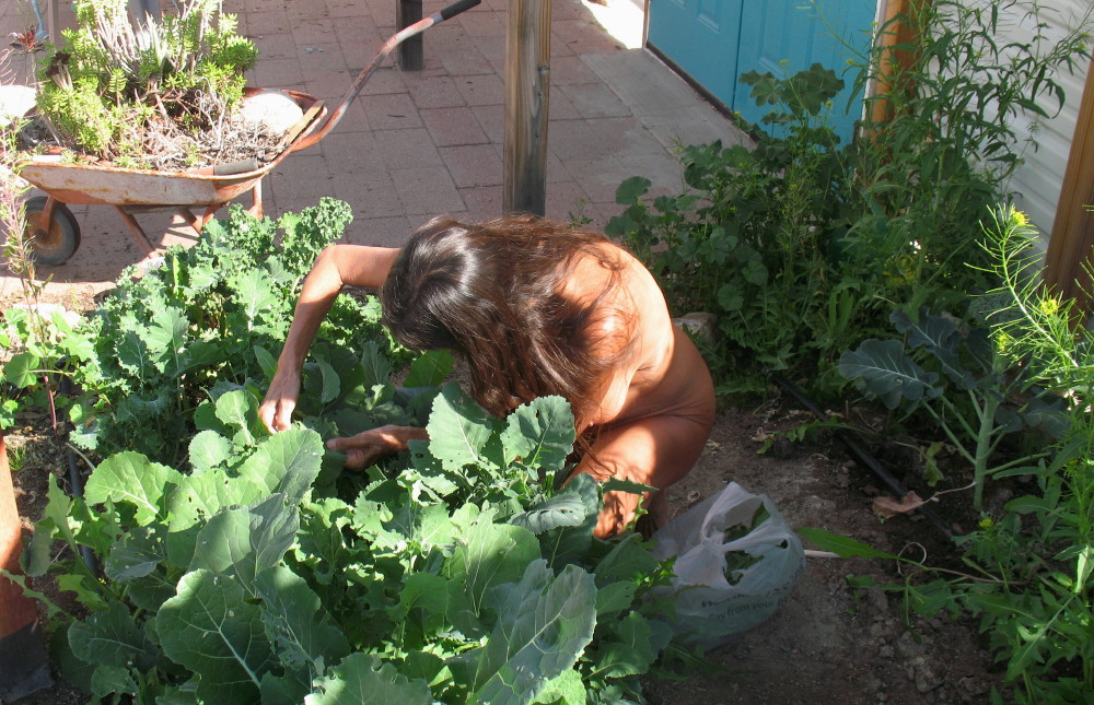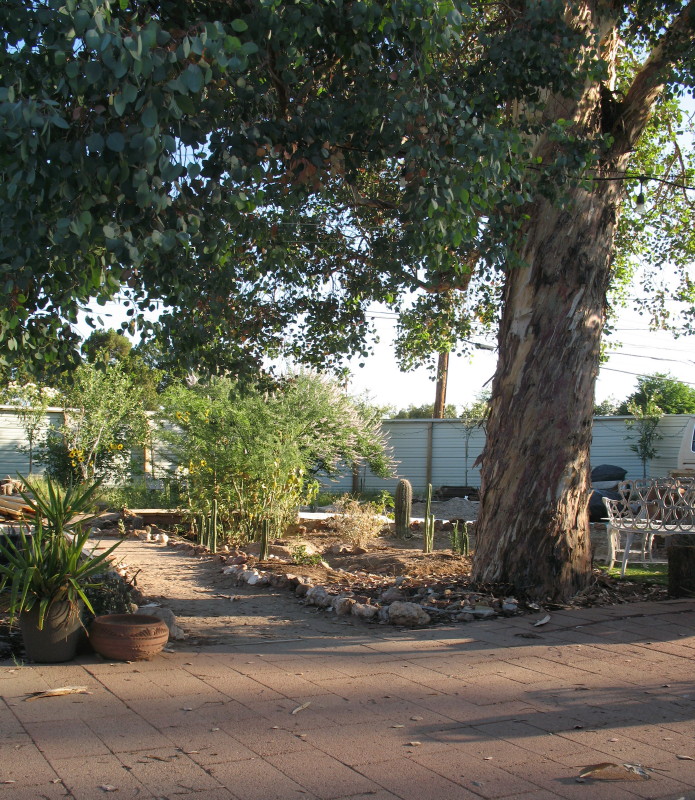 I have been creating a garden out of the previously dirt lot. The house, on a 1/3 acre, is setback from the street, so most of the yard is in front. I constructed a tall privacy wall as the first act, even before I moved in. The flat lot has had canals dug into it, with paths, to collect precious rainwater. With a small bridge, the contours are beginning to feel more natural. Several trees are growing to be shady and comforting. We have established an edible garden amongst this and the four young saguaro, Lorenzo, Barb, Spike and the smallest is yet to be named in time.
