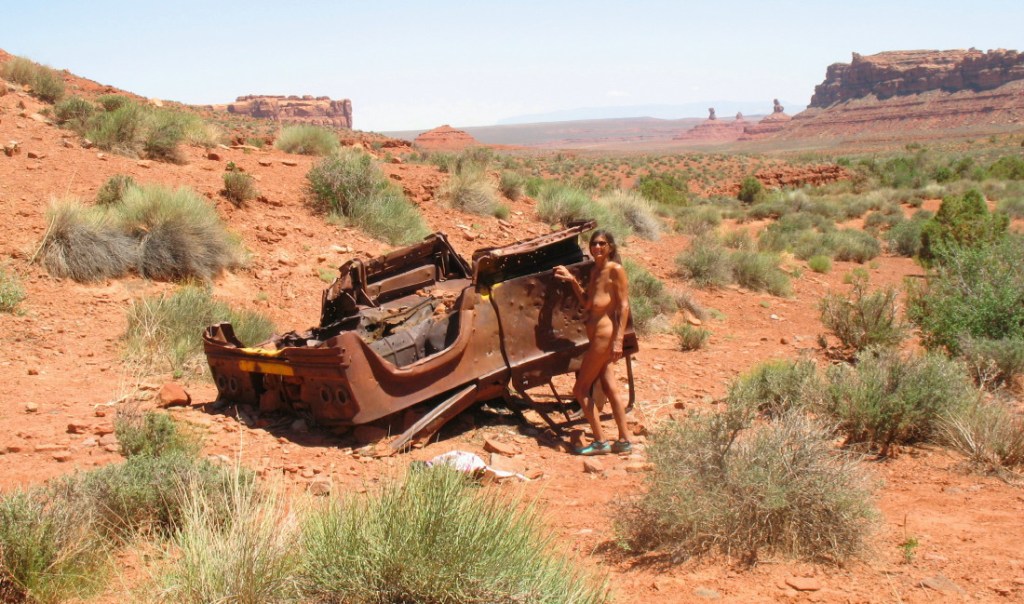 We’re looking for a nude hike, maybe some archeology and a place to camp the night. A dirt bike meets us nearly head-on as it jumps a rise in a hurry. Within a quarter mile on a blind bend amongst several sharp dips and bends, there are more dirt bikers all in leathers and dark helmets gathered around a downed comrade. We pass the man with a short grey stubble of a beard and a pained expression, who obviously made a bad judgment on a slippery surface. He is still lying in the thin road. We gather cloth to throw over us and as we navigate between these people a few feet on each side of us, looking into the cab of my truck. The foolish excited young biker, who nearly jumped on to my truck, was running for help.