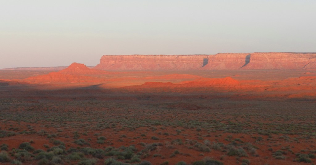 We eat before making a scouting walk around this tower. Sunset has arrived. It has been a good all nude day with a fine hike. The sun makes the reds redder. There is a glow to everything.