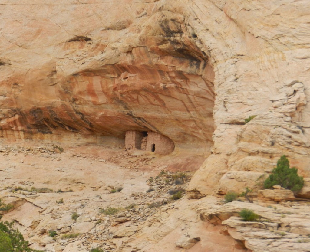There is some topsoil, but mostly a creek bed filled with pieces of fallen sandstone. There had been soil wall to wall, but a flood event has cut and washed its fine sandy textures away. Perhaps this is what contributed to the stress that drove away the inhabitants. Like others in the region, they engineered centuries of watershed management, cultivation of a garden water table with springs and storage. Rains can be sparse and it is essential to make use of the water and the season. For hundreds of years, the land supported these people. It likely was washed away by the actions of rancher’s cattle hooves and over-grazing. Cattle degrade the roots and plants that hold the frail topsoil, they make trails which become funnels when it rains and one event can do much of the erosion, making deep gouges in the precious nutritious soil.