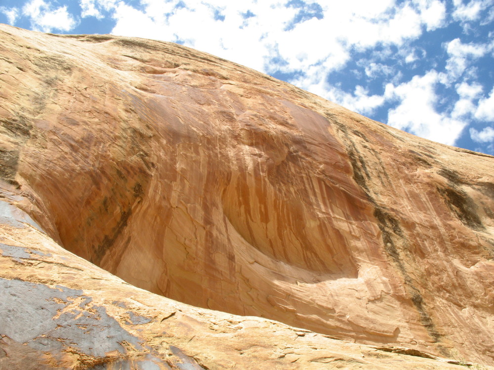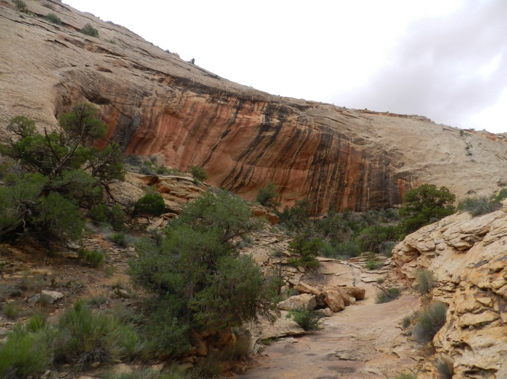 We find that there are three huge cavities in these rock walls. They are arched. Darker, discolored rock have them looking like huge caves in the shape of a fish mouth. These are generally where habitations are found, but no more evidence is seen. We’re further up the canyon, where the tower has now disappeared above the curve of the rock face high above.
