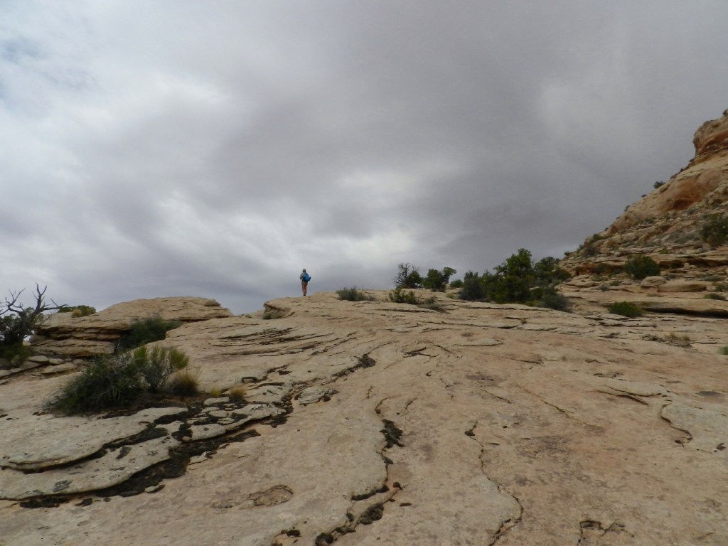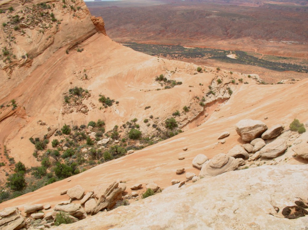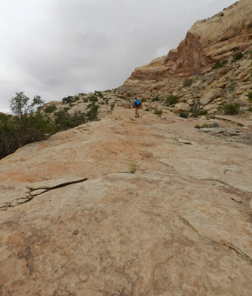 We begin that climb. The sandstone here is gripped securely by our five finger shoes. The slope is close to a stair-step’s grade.