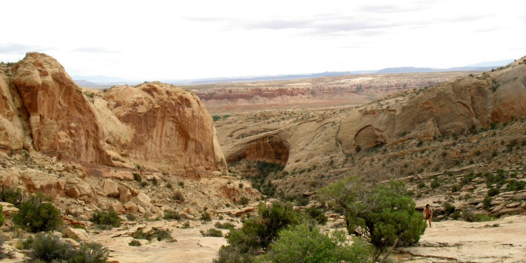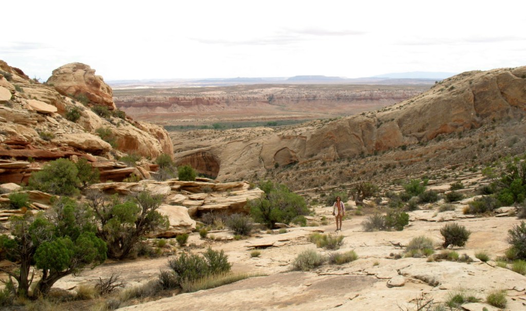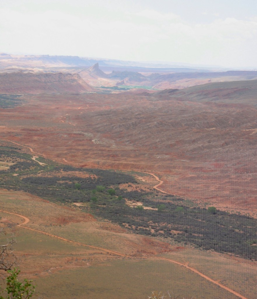 Each time the vista becomes more vast. We see snow covered mountains out in Colorado, equally white clouds rise above them. Another colorful layer and then another, are revealed in their foreground. The huge fish mouth arches that we passed through diminish further and further below us. The riparian wash where our camp lies is a tiny band of green. Our red SUV parked above it, is too small to see.