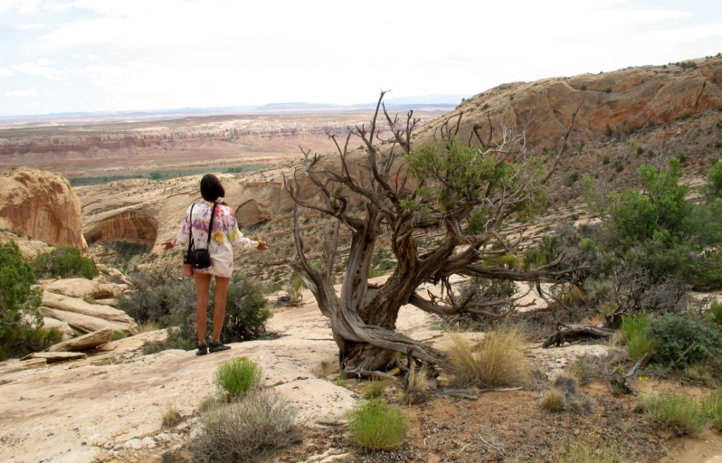 I shout behind me to DF, “Almost there.” When I arrive at the tree, I see that there is so much more still to go. The dead diminished tree is actually still alive. On its opposite side, I see a lone branch that is still green and bushy. The gnarly plants’ survive to an ancient age in the cracks with amazing perseverance. I hold my hands up in love and respect for the tree, happy to see it still living and growing.