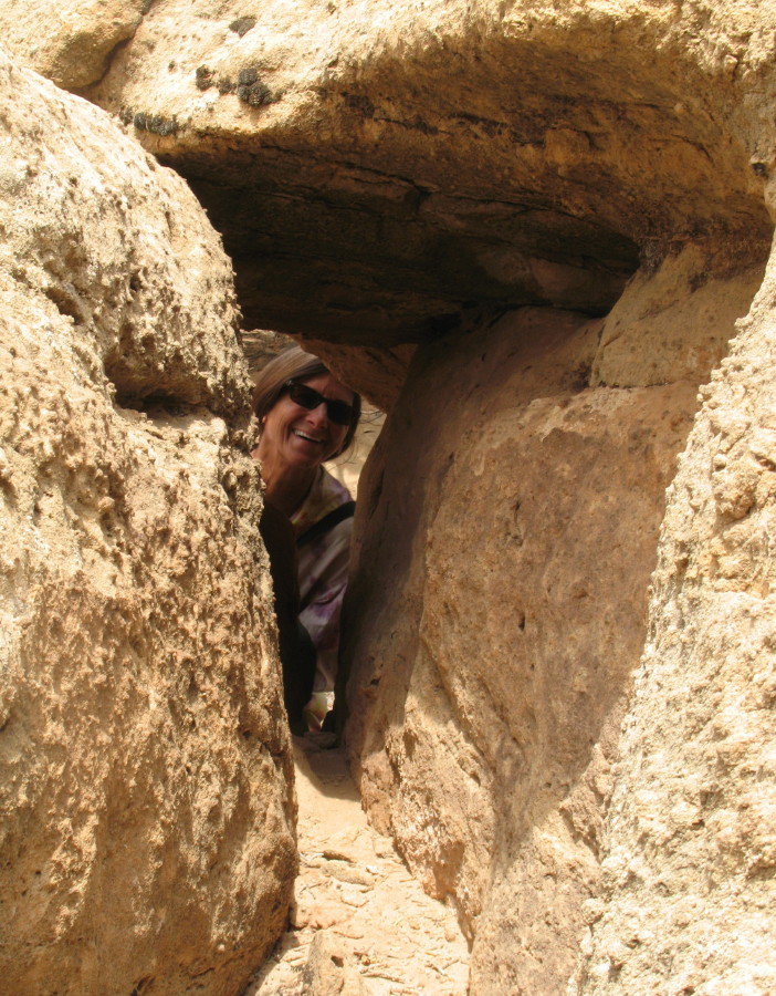As we walk through the increasingly lush canyon, the walls grow taller and soon to several hundreds of feet above us. The geological formation does look like a huge fish mouth. Higher above, we imagine eyes. We have been told of Native American ruins. There, as if its eyeball, we spot a small two story tower building high on a cliff. It looks as though a rock shelf will slope up to it.