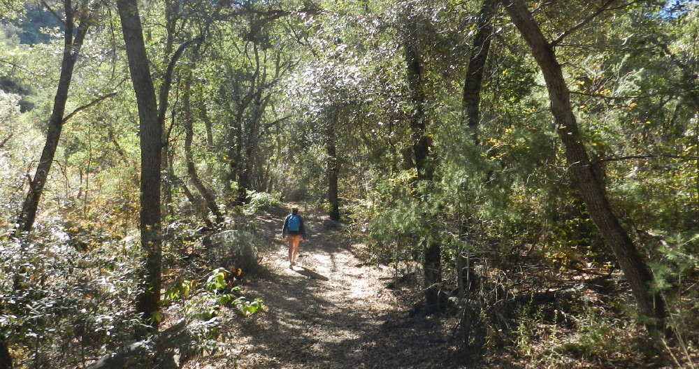 We’ll wait for the sun to warm things up some more, before undressing to an original state. Our stride gets the blood flow going, there is no wind down here in the riparian area under the canopy of trees. Only an occasional light gust is noticed above.