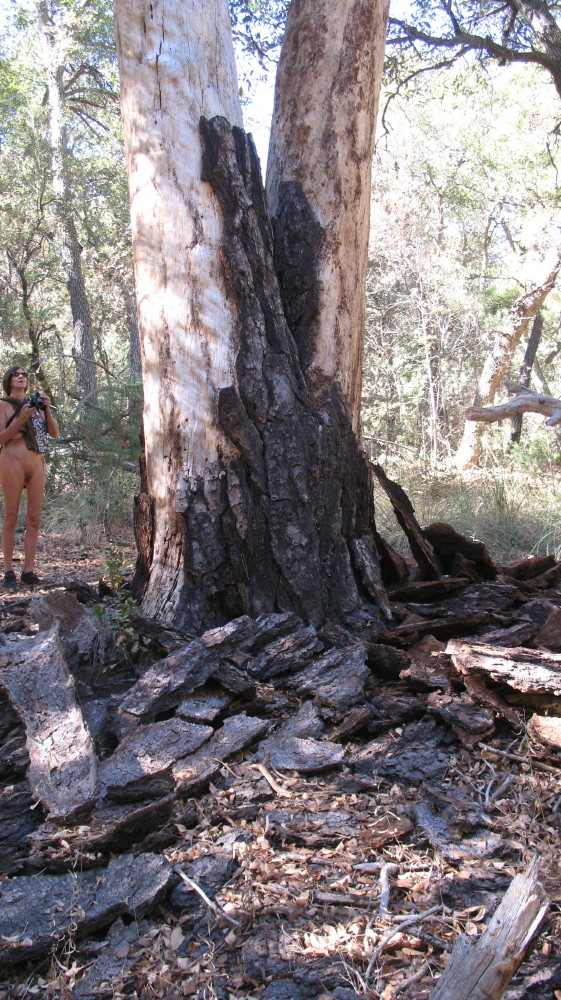 The draping’s stay off as we walk on. DF gets a feel for the air, like dipping a toe into a pool, testing. Today reluctance is in our heads. Taking off up the trail, we feel wonderful to be nude.