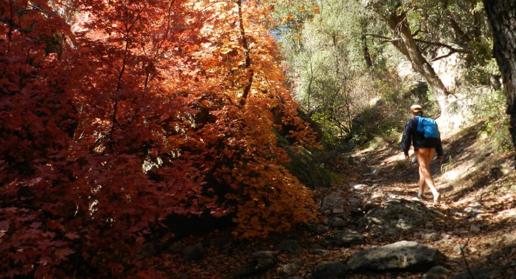 There is a more sustained nip to the air, as the afternoon’s shadow from the canyon’s cliffs begins to cover us. The temperatures fall, as the cold mountain air drops, flowing down the channel of this valley. It is a silent flash flood of cold air. DF puts on a fleece shirt and her cap, which will trap the body heat.