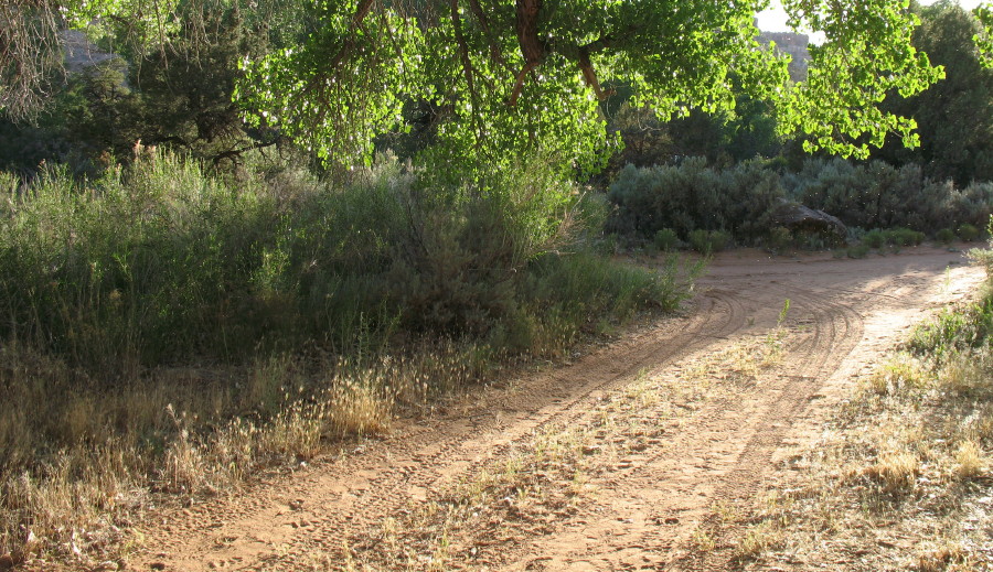 No turnoffs are found, no clear paths are leading back toward the rock slope and to the latter of the series of canyons along this rock face. These have promised ruins and petroglyphs.