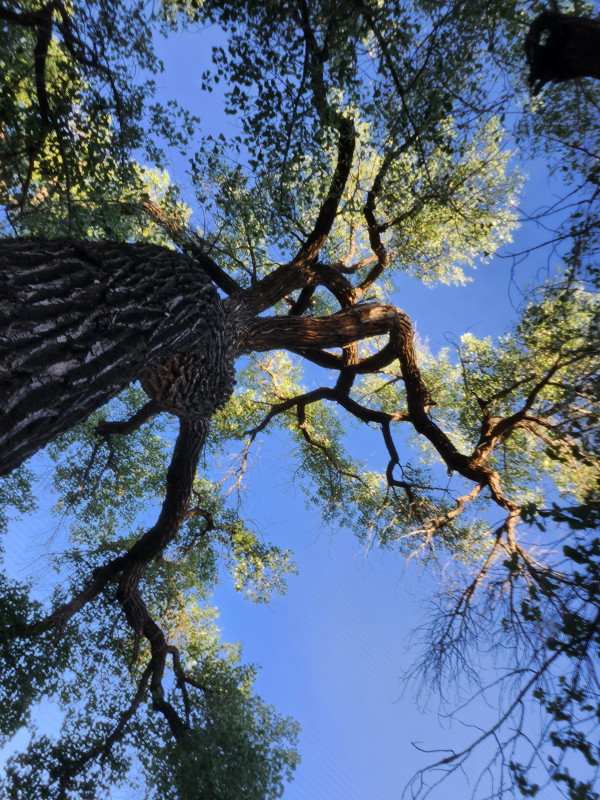 With the top off of the tent, the dawn comes up in luscious/delicious hews. It contrasts lovely with the green cottonwood leaves, which now hang still.