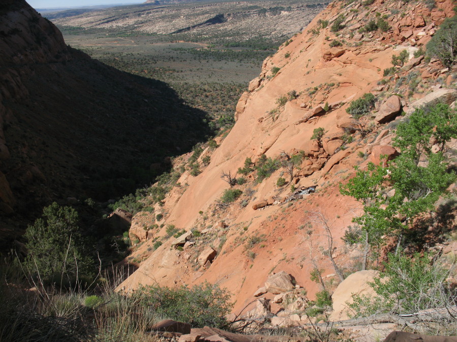 Circling around, the road turns south, now above the wreck, I can trace the likely route where it traveled off of the road. It is unsettling to look down the edge, where the security of the road was lost.