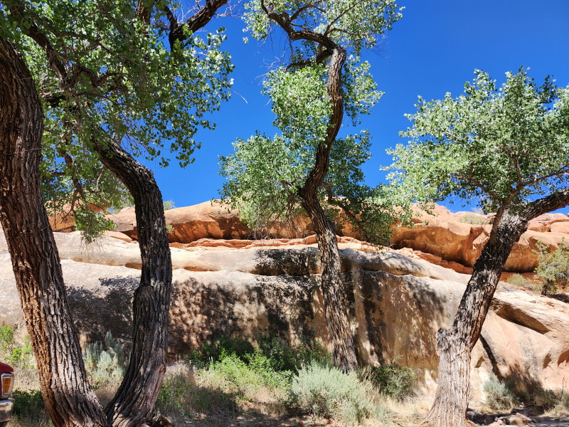 Hands clasp behind my head, I stretch again and feel a smile. I stare at nothing in particular and then follow the gnarly branches of the cottonwood tree to green foliage and the rich contrasting turquoise. In a deep breath, I realize profoundly, how fortunate all of this is. It is time to leave behind the covers and venture naked for the universe to share love.