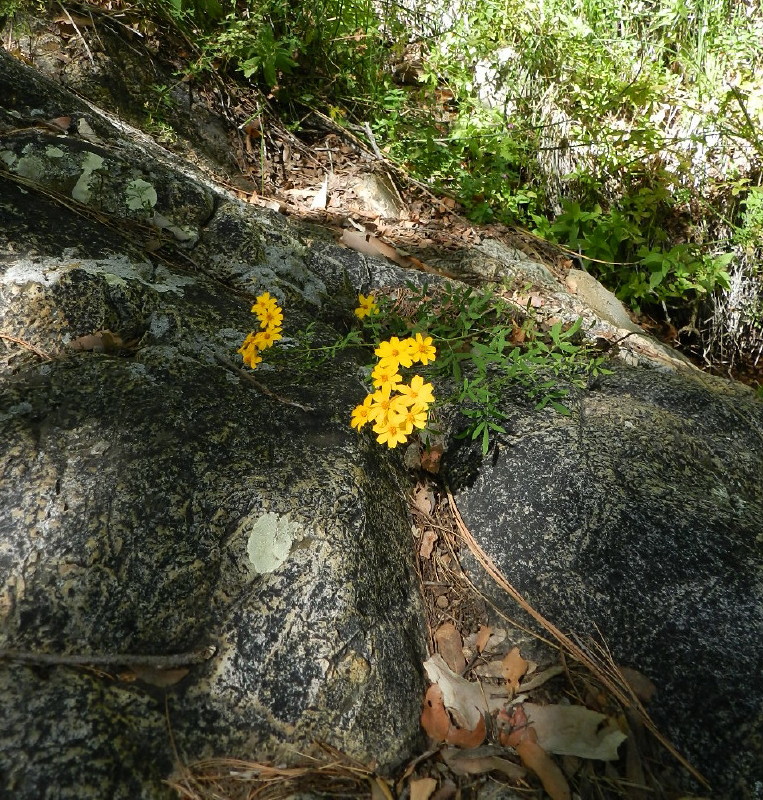 Below us there are fluorescent yellow flowers in beams of light in a shady spot.