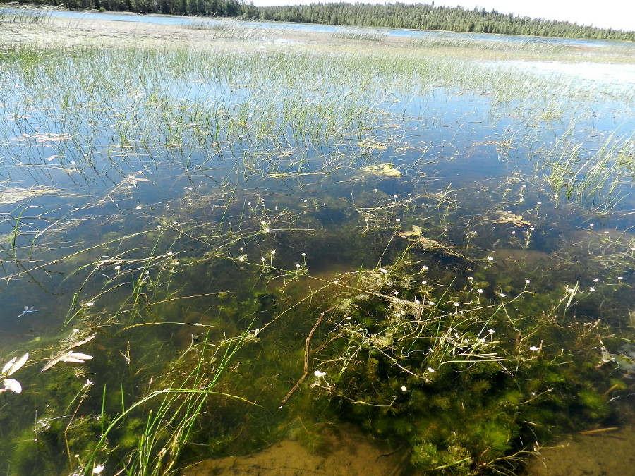 This used to be a solid body of blue water. There are small ducks floating amongst the reeds.
