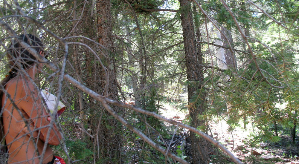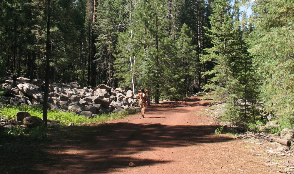 We can feel our way around this ponded section of a creek. There is a sunny open field on the other side. As we cross the field, a quicker ATV comes around and down the road. DF has a small pine tree for cover. I don’t have time to do anything but squat and hope that he keeps his eyes on the road as they pass. Unfortunately, the tourist slows down right there. He quickly notices me and looks confused. He obviously doesn’t comprehend, a naked squatting man in the field in the mountain forest. But as if reading his mind, I realize what this must look like and the only normal explanation for a squat with no pants in a conventional mind. He puts the vehicle in gear and leaves me to my apparent personal duties. I’d never thought of that excuse. It happens to hikers and campers that someone happens along at the wrong moment. I’ve been out three days and seen no one, but at that precise moment, here they come out of nowhere….It’s been Murphy’s Law.