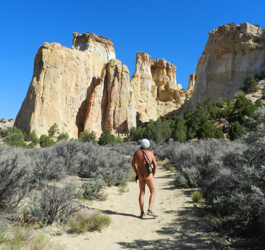 We return along the path, our textile coverings only pads for our cameras and water bottle straps. The other visitors are in the distance hanging around their vehicles. We pass on to where some obstacles block their line of sight and explore the cliffs in closer proximity, before heading back.