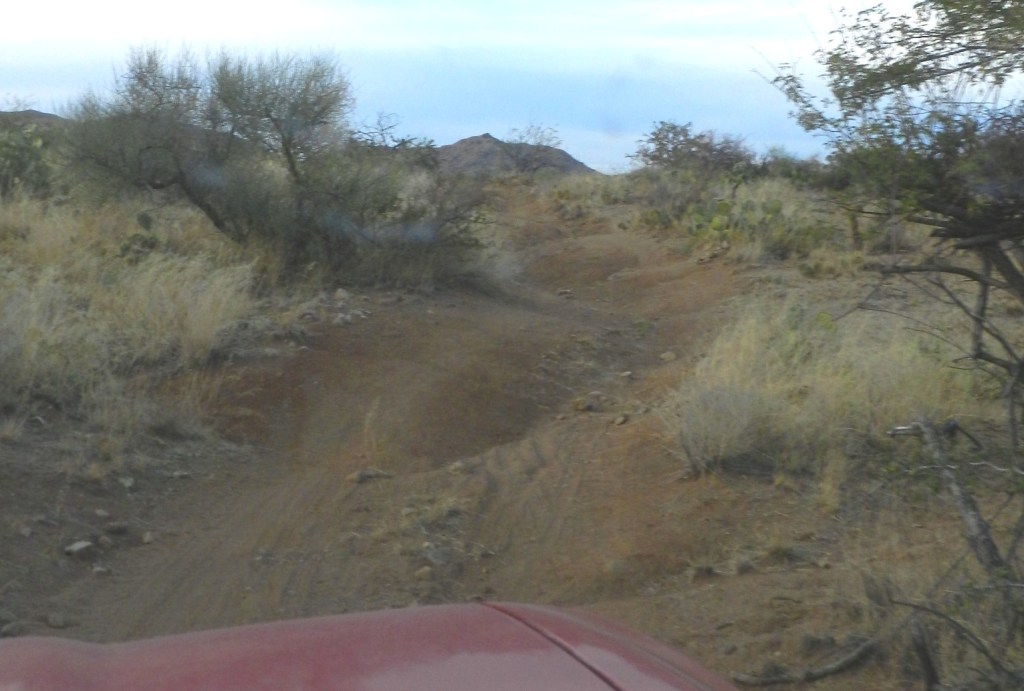 At one point I have to stop to scout and gauge the slope, as we descend into that dry cattle pond, to be sure and not drive blindly off of a cliff, or roll over on the truck’s nose. Still, during the steep descent, a rear tire climbs way off of the ground, a sure sign of border line risk of a nose dive. As I remember, this was the second sharp bend and one more to go.