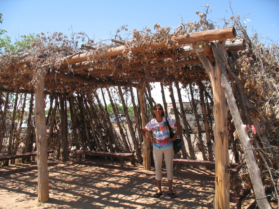 Next to the Hogan is a structure supported by stakes with the leaves still attached, but dry. The branches are upright, or laying across the roof. I walk in to join DF and am stunned by a dramatic difference. It is a comfortable temperature on a hot dry desert day. It is pleasant. I don’t want to leave. Maybe, I could use something like this in my yard at home.