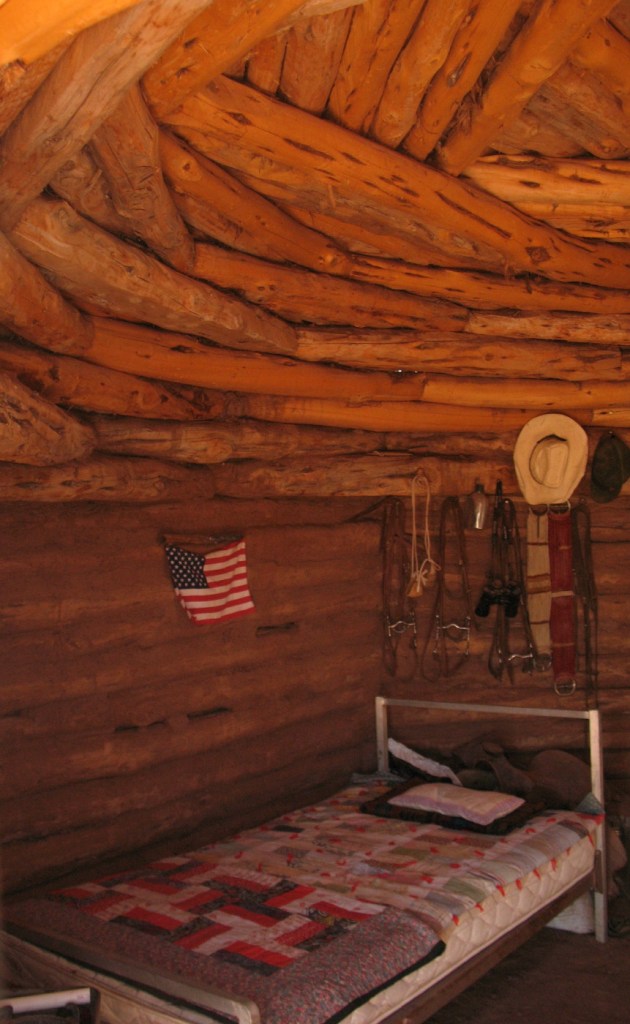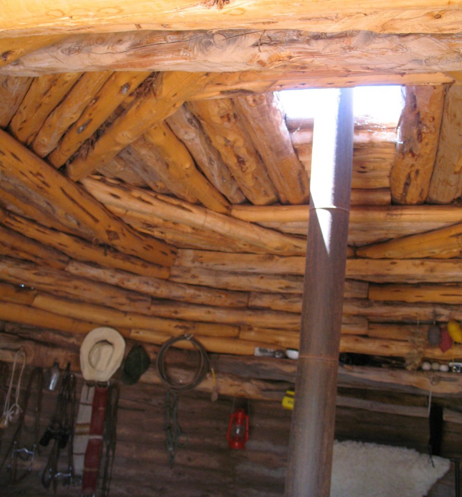 Log cabin walls are nearly round. Each piece and belonging is planted in its place by Navajo, or Dine Feng Shui.