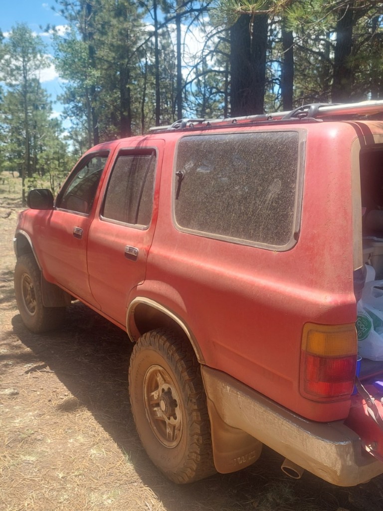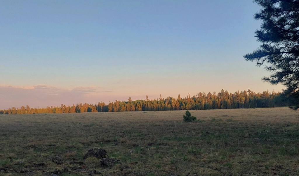 We’re camped in the White Mountains. We’ve returned to our favorite spot, where we spent a month glamping in the big top tent, back in 2023. It is 11am. It’s Dry, with a capital “D”. We are returning to Arizona from Utah in anticipation of the monsoon rains, but the “Monsoon Season” is still languishing down in Mexico. Late yesterday afternoon, we pulled in and the dust that we made while parking made a foggy cloud that just hung there. It finally floated off, as the aspen leaves began to quake.