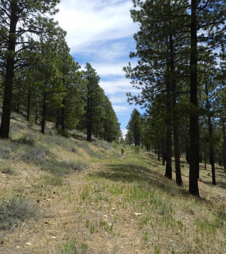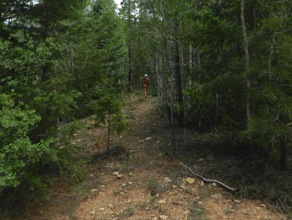 Eventually, back to the fork in the road the trail leads us through an aspen stand, which has taken over the road generally. Then, our route just peters out.