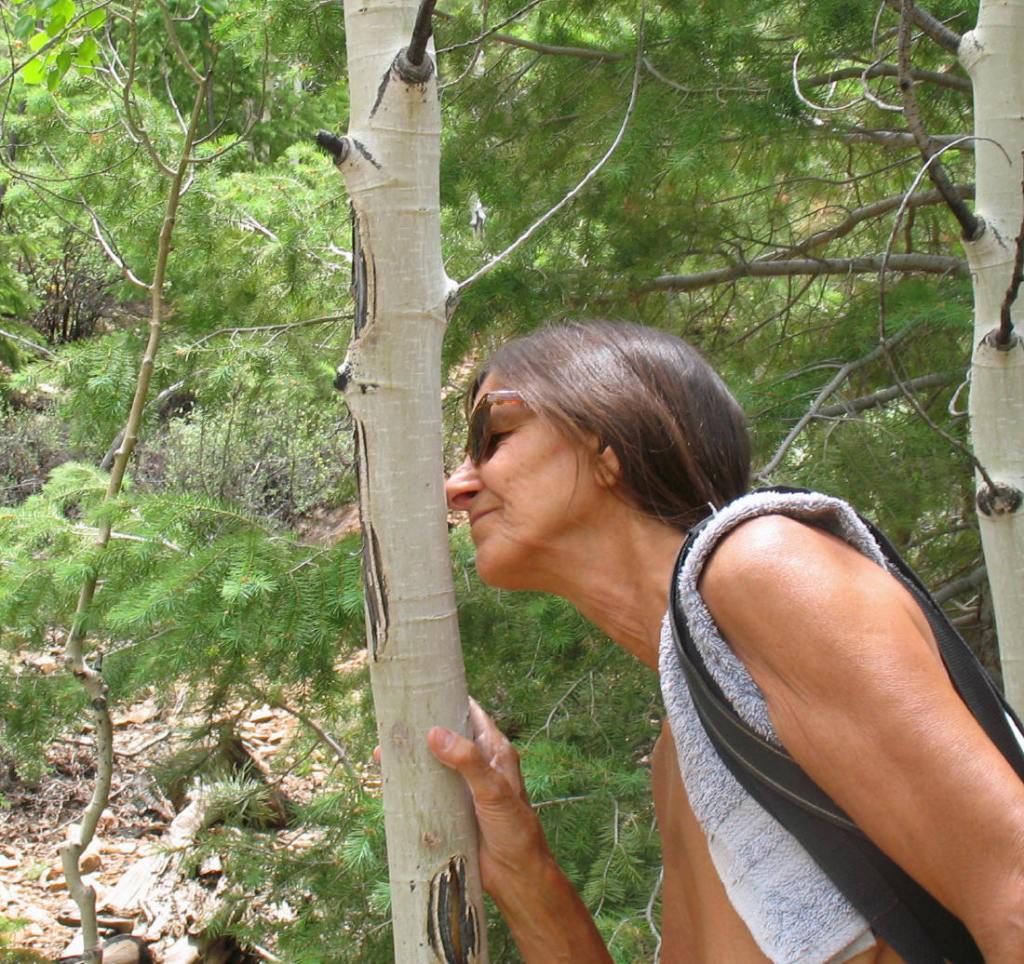In the grove, DF pets the smooth stems of young aspen.